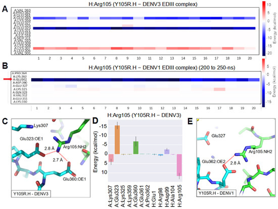 MD simulation of Y105R.H with DENV3 and DENV1 EDIII. Energy decomposition analysis: heat maps show energy contribution of residues that interact with Arg105.H per frame in the (A) Y105R.H-DENV3 EDIII complex and (B) Y105R.H-DENV1 EDIII complex. Twenty frames with a 2.5-ns interval were extracted from the last 50-ns of the simulation for Y105R.H-DENV3 complex (A), and from 200 to 250-ns of the simulation for Y105R.H-DENV1 complex (B). Red arrows highlight residues strongly interacting with Arg105.H. (C) In the Y105R.H-DENV3 EDIII complex, new salt bridges were formed between (1) NH2 of Arg105.H and OE1 of Glu323 and (2) NH2 of Arg105.H and OE1 of Glu360. The interacting atoms are connected by red dashed lines with distances labeled in a representative snapshot. (D) Energy contribution of residues that interacted with Arg105.H, corresponding to the heatmap in (A). The bars represent averages and solid lines represent the standard deviation. The EDIII, 1A1D-2 heavy chain and light chain are designated as A, H, and L chain, respectively. (E) A salt bridge was formed between NH2 of Arg105.H and OE2 of Glu362 in the Y105R.H-DENV1 complex. The atom pair is connected by a red dashed line with the distance labeled in a representative snapshot.