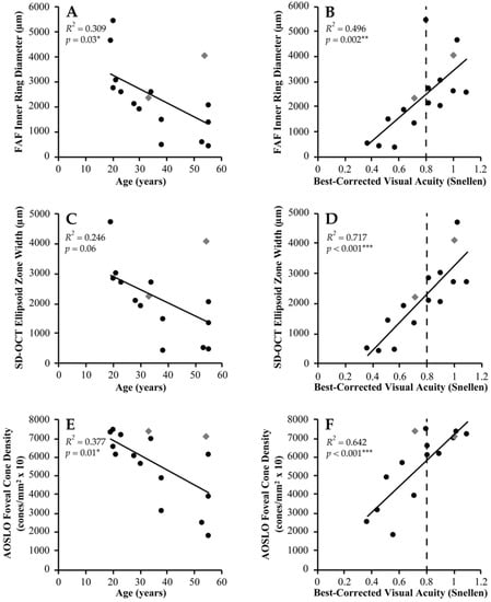 - Ratnam, K.; Carroll, J.; Porco, T.C.; Duncan, J.L.; Roorda, A. Relationship between foveal cone structure and clinical measures of visual function in patients with inherited retinal degenerations. Investig. Ophthalmol. Vis. Sci. 2013, 54, 5836–5847. [Google Scholar] [CrossRef]