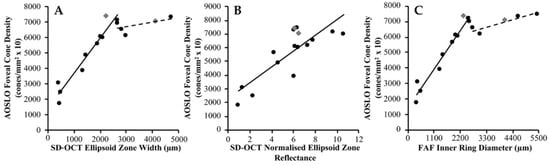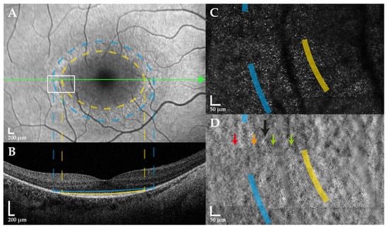 - Saleh, M.; Flores, M.; Gauthier, A.S.; Elphege, E.; Delbosc, B. Quantitative analysis of photoreceptor layer reflectivity on en-face optical coherence tomography as an estimator of cone density. Graefe’s Arch. Clin. Exp. Ophthalmol. 2017, 255, 2119–2126. [Google Scholar] [CrossRef]