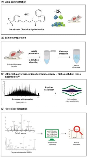 Experimental proteomics workflow for identification of proteins and verification of the presence of fluoridated peptides: (A) Cinacalcet drug administration; (B) Sample preparation to proteomic analysis; (C) Chromatographic peptides separation by ultra-high liquid chromatography (nano-UHPLC) and analysis by high-resolution mass spectrometry; (D) Data analysis including peptide/protein identification with the Mascot search algorithm and manual inspection of an experimentally generated MS/MS spectrum with the theoretical MS/MS spectrum of identified fluorinated peptides.