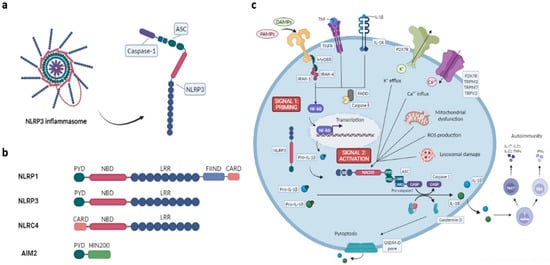 - Zhang, Y.; Yang, W.; Li, W.; Zhao, Y. NLRP3 Inflammasome: Checkpoint Connecting Innate and Adaptive Immunity in Autoimmune Diseases. Front. Immunol. 2021, 12, 4166. [Google Scholar] [CrossRef] [PubMed]