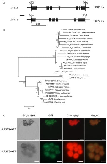 Plant fatty acyl-ACP thioesterase (FAT) proteins are encoded by nuclear genes and targeted to plastids by a transit peptide at the N-terminus. Previous studies have predicted the transit peptide sequences in the N-terminals of JcFATA and JcFATB as shown in Figure S2 according to the previous studies [,,,]. To determine the subcellular localization of JcFATA and JcFATB, the intact ORF without the stop codon of JcFATA and JcFATB were fused to the N-terminus of GFP (green fluorescent protein), respectively, driven by 35S promoter, and then used to transform Arabidopsis green leaf protoplasts for transient expression. In transformed cells, the green GFP signals overlapped with red chlorophyll autofluorescence, which indicated that JcFATA and JcFATB both localized in chloroplasts (Figure 1C).
