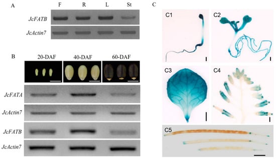 Expression profiles of JcFATA and JcFATB. (A) Expression of JcFATB in different tissues analyzed by semi-quantitative RT-PCR in J. curcas. F, flowers at 5 DAF (days after flowering); R, L, and St indicates mature roots, leaves, and stems. (B) Expression of JcFATA and JcFATB in developing seeds at 20, 40, and 60 DAF in J. curcas as analyzed by semi-quantitative RT-PCR. JcActin7 was used as an internal control for RT-PCR. Scale bars = 1 cm. (C) Expression profiles of JcFATB analyzed by GUS staining. (C1,C2) JcFATB:GUS seedlings at 5 and 15 DAG (days after germination); (C3) A true leaf from a 30-DAG JcFATB:GUS plant; (C4) The top part of inflorescence of the JcFATB:GUS plant; (C5) Siliques at different development stages of the JcFATB:GUS plant. Scale bars = 1 mm.