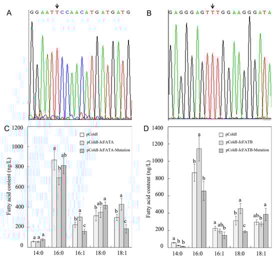 Analysis of the conserved catalytic active sites of JcFATA and JcFATB by prokaryotic expression. (A,B) Determination of the site-specific mutagenesis of JcFATA (A) and JcFATB (B), where the small black arrow indicates the mutated nucleotides and their sequencing peaks. (C,D) Analysis of the fatty acid contents of E. coli clones expressing wild-type JcFATA and JcFATB, and their mutant versions (JcFATA-Mutation and JcFATB-Mutation), respectively. pCold I was used as the prokaryotic expression vector. Each value in (C,D) was the mean of three measurements. Error bars = SD (standard deviation). Data within a column followed by different letters (a, b, and c) are significantly different at p ≤ 0.05 as determined by Duncan’s multiple range test.