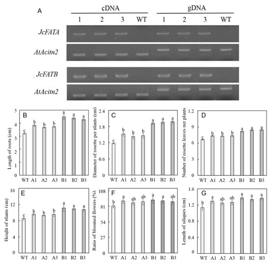 Heterologous expression of JcFATA and JcFATB promoted plant growth and development of A. thaliana. (A) Molecular characterization of 3 JcFATA (1, 2, 3) and 3 JcFATB (1, 2, 3) ectopic expression lines by semi-quantitative RT-PCR and PCR analysis. Wild-type ecotype Columbia (Col-0) was used as the negative control. (B) Root length of the 8-DAT (days after transplanting) A. thaliana plants expressing JcFATA and JcFATB. (C,D) Diameter and number of rosette leaves of the 20-DAT A. thaliana plants expressing JcFATA and JcFATB. (E,F) Plant height and bloomed ratio of the 28-DAT transgenic A. thaliana plants expressing JcFATA and JcFATB. (G) Silique length of the 50-DAT A. thaliana plants expressing JcFATA and JcFATB. Each value was the mean of three measurements. Error bars = SD (standard deviation). Data within a column followed by different letters (a, b, and c) are significantly different at p ≤ 0.05 as determined by Duncan’s multiple range test.