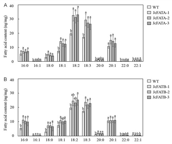 Fatty acid compositions of the seed storage lipids of the A. thaliana plants expressing JcFATA and JcFATB. Fatty acid compositions of the seed storage lipids of the JcFATA (A) and JcFATB (B) heterologous expression lines. Each value is the mean of three measurements. Error bars = SD (standard deviation). Data within a column followed by different letters (a, b) are significantly different at p ≤ 0.05 as determined by Duncan’s multiple range test.