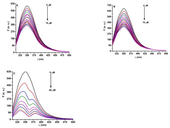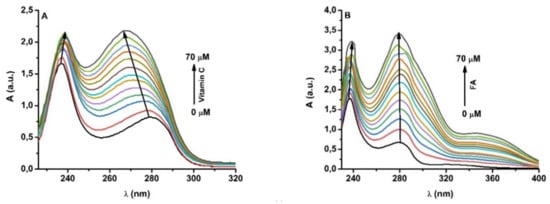 Solutions of increasing concentrations of vitamin C ((0–70) μM), FA ((0–70) μM) and B12 ((0–40) μM) were added to the BSA-LT4 complex (3 µM and 15 μM LT4). The concentration of LT4 was chosen to assure the saturation of the protein binding site with LT4. Due to the Trp residue, the maximum of the absorbance of BSA is ~280 nm, while the specific absorbance wavelength for LT4 is ~237 nm. The maximum of BSA absorption shifts towards lower wavelengths (a hypsochromic effect) with increasing vitamin C concentration, while the maximum of LT4 absorption shifts less significantly and bathochromically (ΔλBSA ≅ 11.71 nm and ΔλLT4 ≅ 1.74 nm) (see Figure 1A). In the case of FA (see Figure 1B) there is no shift for the BSA absorption maximum, while ΔλLT4 ≅ 1.61 nm. However, at ~300 nm, a shoulder appears on the BSA peak for a concentration higher than 20 µM FA, suggesting the appearance of a conjugated system. Both FA and LT4 have an amino moiety. It is known that the BSA-LT4 complex formation occurs via -NH2 groups [28]. Because the structure of the BSA is already complexed with LT4, Figure 1 shows the binding that FA will compete with LT4 in order to bind to the protein active site. A similar scenario occurs in the presence of B12 (see Figure 1C). The BSA absorption peak remains unchanged while, starting with the first concentration of B12, a shoulder at 287 nm appears. Furthermore, the specific absorption peak of B12 (characteristic in water) is clearly visible at 362 nm. In addition, for LT4 absorption, ΔλLT4 ≅ 2.80 nm, with a bathochromic shift, suggests a stronger interaction of the BSA-LT4 complex with B12.