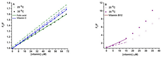 The Stern-Volmer representation of F0/F vs. [vitamin] for BSA-LT4/vitamin C, and BSA-LT4/folic acid complexes (A) and for the BSA-LT4/vitamin B12 (B) at 25 °C (empty circles) and 35 °C (full circles).