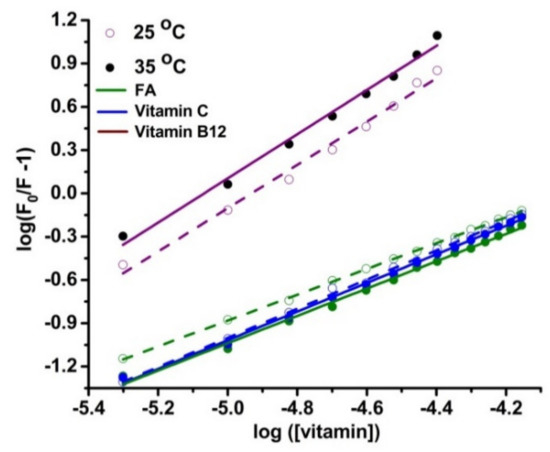 The Scatchard plot of log(F0/F − 1) against log[vitamin] at 25 °C (empty circles) and 35 °C (full circles).