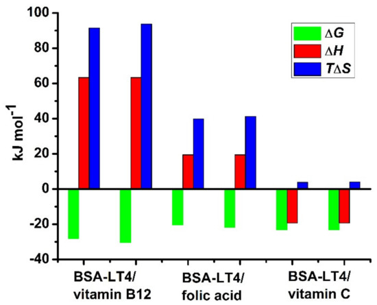 The values of the thermodynamic parameters of interaction are an indication of the forces that drive the interaction process. For the binding of vitamins to BSA-LT4 complex (see Table 1 and Figure 5) the most enthalpic process is the binding of vitamin B12 to BSA-LT4. Also, for BSA-LT4/vitaminB12 and BSA-LT4/folic acid, ΔH > 0 and ΔS > 0, thus these processes are mainly driven by hydrophobic interaction. For BSA-LT4/vitamin C, ΔH < 0 and ΔS > 0, and this process is driven by electrostatic forces [36].