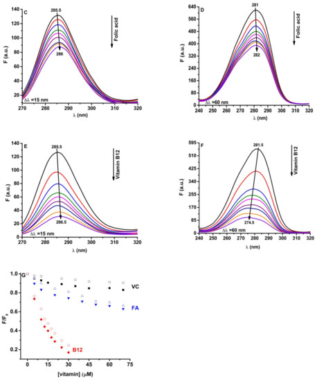 Synchronous fluorescence spectra of BSA-LT4 in the presence of different concentrations of vitamin C, folic acid, and vitamin B12 (Δλ = 60 nm and Δλ = 15 nm) The significance of the colors is explained by the arrow in the figure that indicates the direction of increase of the concentration of each compound in the 3 situations (A–F). Quenching of BSA-LT4 synchronous fluorescence by vitamins plotted as the quenching of BSA synchronous fluorescence (F/F0) by vitamin concentrations (G): empty symbols correspond to Δλ = 15 nm and full symbols correspond to Δλ = 60. The name of the compound is next to the corresponding lines.