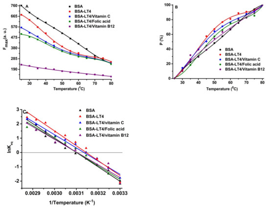 (A) The fluorescence maxima during the thermal denaturation processes of BSA (3 µM), BSA-LT4 ([LT4] = 3 µM), and BSA-LT4/vitamins ([vitamin] = 10 µM). (B). The percentage (P) of BSA denaturation as a function of temperature. (C) Graphical representation of lnKeq vs. temperature.