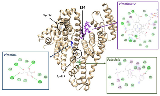 Molecular docking showed two different binding sites for vitamin C and folic acid and vitamin B12, respectively. In this way, the result obtained in fluorescence which shows that vitamin B12 is closer to the BSA-LT4 site than vitamin C and folic acid is confirmed.