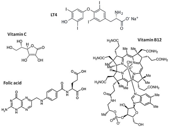 The chemical structures of the LT4, vitamin B12, vitamin C and folic acid molecules.