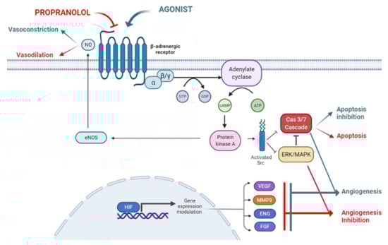 The ADBR signaling in the presence of the ligand, which will be blocked by propranolol. According to this model propranolol would decrease de adenylate cyclase activity, decreasing the cAMP (cyclic Adenosine Monophosphate) levels and the activation of PKA (Protein Kinase A). Activation of eNOS (endothelial Nitric-Oxyde Synthase) by PKA will be decreased leading to vasoconstriction. On the other hand, the decrease in PKA activity will affect Src (Proto-oncogene tyrosine-protein kinase Src) expression impairing the HIF-1 (Hypoxia Inducible Factor 1) nuclear translocation with the downregulation of its nuclear targets such as pro-angiogenic genes VEGF (Vascular Endothelial Growth Factor), MMP9 (Matrix Metallopeptidase 9), ENG (Endoglin) and FGF (Fibroblast Growth Factor). The decreased phosphorylation of ERK/MAPK (ERK, Extracellular Signal-Regulated Kinase; MAPK, Mitogen-Activated Protein Kinase) kinases cascade and Src will activate the caspase cascade leading to apoptosis. Created by Biorender.com.
