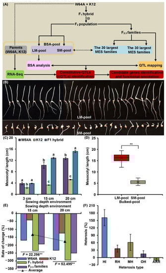 Performance of mesocotyls at three sowing environments. (A) Schematic diagram of experimental population construction and analysis. (B) Performance of the mesocotyl length (MES) of LM pool (the 30 largest MES-pool) and SM pool (the 30 shortest MES-pool) at a 20 cm sowing environment. (C) MES of the parents (W64A and K12) and their F1 hybrid under 3, 15, and 20 cm sowing environments, respectively; different lowercase letters with different materials in a single environment indicated a significant difference with p < 0.05 (ANOVA). (D) Boxplot of MES showing the difference between LM pool and SM pool used for a BSA under 20 cm sowing environment; asterisks indicated significant differences (** p < 0.01; ANOVA). (E) Compared to 3 cm sowing conditions, the rate of change (RC) of MES in two parents, F1 hybrid, and F2:3 population under 15 and 20 cm sowing conditions, respectively; asterisks indicated significant differences (** p < 0.01; ANOVA). (F) Heterosis analysis (HI: F1 heterosis index, RH: relative heterosis, MH: mid-parent heterosis, OH: over-parent heterosis, ARR: F2:3 advantage reduction rate) of MES.