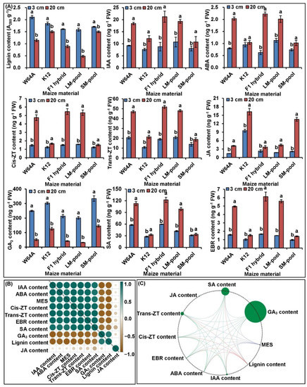 Nine physiological traits assay and the correlation relationship between all physiological traits and mesocotyl length (MES) from W64A and K12. (A) Statistics of lignin content, indole-3-acetic acid (IAA) content, abscisic acid (ABA) content, gibberellic acid 3 (GA3) content, 24-epibrassinolide (EBR) content, cis-zeatin (Cis-ZT) content, trans-zeatin (Trans-ZT) content, jasmonic acid (JA) content, and salicylic acid (SA) content from mesocotyls of five maize materials under 3 and 20 cm sowing environments; different lowercase letters with a single maize material under different environments indicated a significant difference with p < 0.05 (ANOVA). (B,C) Correlation coefficient diagram and interactive ring correlation diagram (which were prepared using the Genescloud tool; https://www.genescloud.cn (accessed on 6 April 2022)), among these, nine traits of maize materials under different environments).