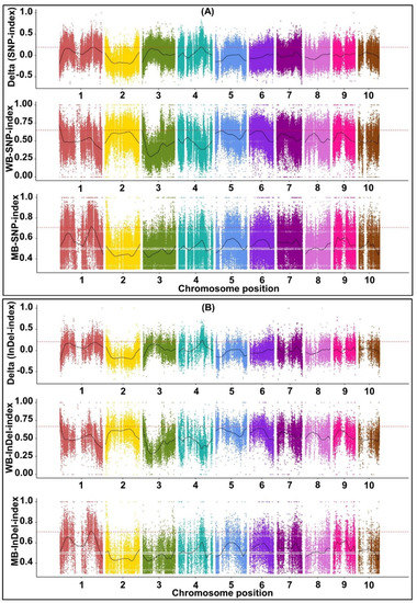 The depth of the reads for homozygous SNPs/InDels in the offspring pools was then acquired and used to calculate the SNP/InDel index, as described previously by Takagi et al. [23]. The ΔSNP-index was simulated for more than 10,000 replicates for each bulk, based on the population type and size. Then, quantiles (99%) from the simulations were used to estimate confidence intervals. An actual ΔSNP-index averaged over a sliding window that lay outside of the confidence interval indicated a linked region related to MES. Then, we applied Blast software to perform deep annotation in multiple databases: Nr (http://www.ncbi.nlm.nih.gov/pubmed (accessed on 10 November 2021)), GO (http://bioinfo.cau.edu.cn/agriGO/ (accessed on 10 November 2021)), KEGG (http://www.genome.jp/kegg/ (accessed on 10 November 2021)), COG (https://www.ncbi.nlm.nih.gov/COG/ (accessed on 10 November 2021)), and Swiss-Prot (https://web.expasy.org/docs/swiss-prot_guideline.html (accessed on 10 November 2021)), using the coding genes in the candidate interval.