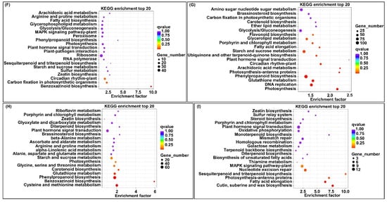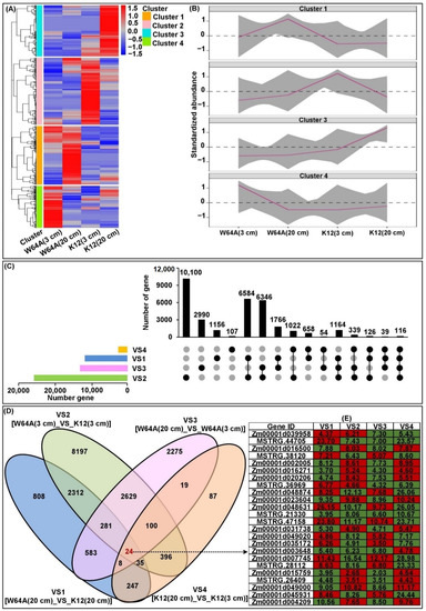 Nine RNA-Seq libraries were constructed from the mesocotyls of W64A and K12 under 3 and 20 cm sowing conditions. An average of 7.49 G clean reads with a Q30 value of 94.38% were obtained from each sample (Table S5) of which there were 50.76 billion high-quality (HQ) clean reads. Then, approximately 88.86% of the HQ clean reads were aligned against the Zea_mays. B73_V4 reference genome. Finally, 18,001 DEGs were identified across all comparisons [VS1: W64A (20 cm)_VS_K12 (20 cm); VS2: W64A (3 cm)_VS_K12 (3 cm); VS3: W64A (20 cm)_VS_W64A (3 cm); and VS4: K12 (20 cm)_VS_K12 (3 cm)] (Figure 5A–D). It was interesting to note that 24 core conserved DEGs were further detected during our comparative analyses (Figure 5D,E; Table S6). It is possible that these core conserved DEGs may be associated with important traits such as mesocotyl elongation that fundamentally differs between the two parents. In addition, the DEGs in each comparison were subjected to KEGG pathway enrichment analysis; the top-20 pathways were “plant hormone signal transduction (map04075)”, “phenylpropanoid biosynthesis (map00940)”, “circadian rhythm-plant (map04712)”, “zeatin biosynthesis (map00908)”, and “porphyrin and chlorophyll metabolism (map00860)” (Figure 5F–I). These data suggested that the differences of MES between W64A and K12 under different sowing environments may be influenced by multiple DEGs in specific KEGG pathways.