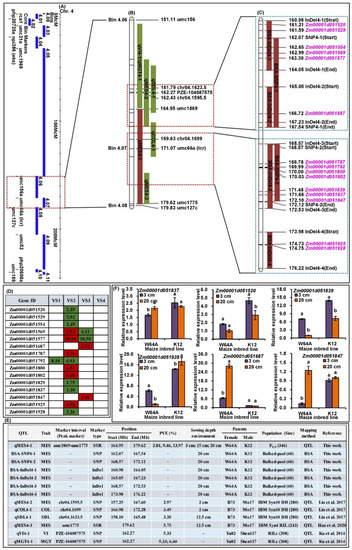 cQMES4 region and corresponding candidate genes information. (A) Distribution of different Bins on maize chromosome 4. (B) Physical map information of cQMES4 that contained multiple overlapped QTLs for mesocotyl length (MES), coleoptile length (COL), seedling length (SDL), vigor index (VI), and mean germination time (MGT). (C) Physical map information of cMES4 that including our six linked BSA regions and 15 identified candidate genes in cQMES4. (D) The expression patterns of 15 identified candidate genes in cQMES4 by RNA-sequencing; the red-box or green-box representing the corresponding gene was up-regulated or down-regulated, and the value in the box was the log2 fold-change of the corresponding gene. (E) Summary of all QTLs and linked BSA regions information in cQMES4 region from our work and previous studies. (F) Relative expression level of six candidate gens in W64A and K12 mesocotyls under 3 and 20 cm sowing environments; different lowercase letters with a single parent under different environment indicated a significant difference with p < 0.05 (ANOVA).