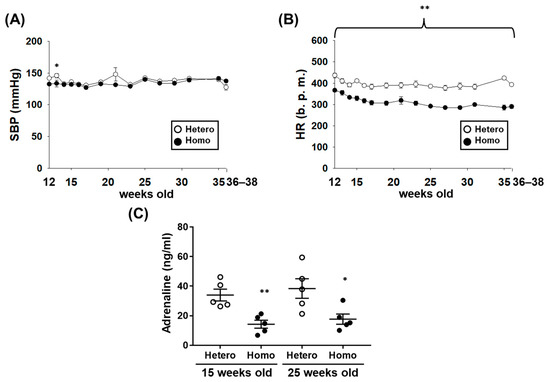 There was almost no difference in systolic blood pressure (SBP) between Hetero and Homo (Figure 2A, Table 1). Interestingly, HR in Homo was significantly lower than Hetero (Figure 2B, Table 1, p < 0.01). In order to explore mechanisms of decrease in HR, we examined the plasma adrenaline concentration. It was significantly lower in Homo than Hetero at 15 and 25 weeks old (Figure 2C, p < 0.01 at 15 weeks old, p < 0.05 at 25 weeks old). The heart weight in Homo at 36–38 weeks old was slightly higher than Hetero (Table 1, p < 0.05).
