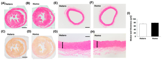Histological changes in ventricles and mesenteric arteries in Homo at 36–38 weeks old were not observed compared with Hetero (Figure 3A,B,E,F). The accumulation of collagen was not observed in the perivascular and myocardium regions of the ventricles from both strains (Figure 3C,D). There was no significant difference in the medial wall thickness of the mesenteric arteries among the strains (Figure 3G–I).