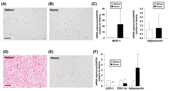 The adipocyte hypertrophy was not observed in perirenal white adipose tissue (WAT) from Hetero and Homo (Figure 4A,B). On the other hand, the weight of WAT in Homo at 36–38 weeks old was significantly higher than Hetero (Table 1, p < 0.01). The mRNA expression level of monocyte chemotactic protein (MCP)-1, a mediator of inflammation [20], in WAT from Homo was significantly higher than Hetero (Figure 4C, p < 0.05). There was no significant difference in the mRNA expression level of adiponectin, which is exclusively released from WAT [21] (Figure 4C). Interscapular brown adipose tissue (BAT) in Homo contained a large droplet like WAT but not a small lipid droplet (normally contained in BAT) compared with Hetero (Figure 4D,E). Uncoupling protein (UCP)-1 and peroxisome-proliferator-activated receptor γ coactivator-1α (PGC-1α) are highly expressed in BAT [22]. The mRNA expression levels of UCP-1 and PGC-1α in interscapular adipocytes from Homo were significantly lower than Hetero (Figure 4F, p < 0.01 in UCP-1; p < 0.05 in PGC-1α). We confirmed that the protein level of UCP-1 in interscapular adipocytes was lower in Homo than Hetero (data not shown, n = 5). On the other hand, the mRNA expression level of adiponectin (a WAT marker) in interscapular adipocytes from Homo was significantly higher than Hetero (Figure 4F, p < 0.05). The weight of interscapular adipocytes in Homo at 36–38 weeks old was significantly higher than Hetero (Table 1, p < 0.05).