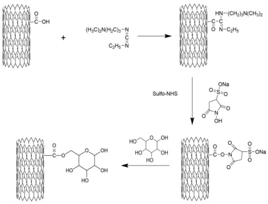 In recent years, CNTs have gained much attention in the field of applied materials science, and several studies have shown that functional modifications can greatly reduce their biotoxicity [,,]. C-MWCNT can be modified with mannose by the carbodiimide catalysis method by activating the surface carboxyl group of CNT. In this reaction, EDC is added to the CNT solvent. Then, the activated surface carboxyl group of the CNT forms an EDC-CNT intermediate. Next, pyridine is added for catalytic esterification, and the EDC intermediate reacts with the -OH of mannose to yield M-MWCNT. The reaction conditions of this method are mild and controlled excluding the influence of excessive organic matter on subsequent experiments [].