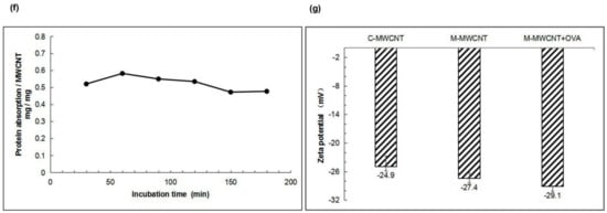 Zeta potential analysis: The surface charge of a CNT directly affects its stability. The potential of CNTs can be estimated by measuring the electromotive force of surface colloidal particles. Zeta potential values of C-MWCNT, M-MWCNT, and M-MWCNT+OVA in 10 mM of PBS were measured by a nanoparticle size potential analyzer (Anton Paar, Litesizer 500, Vienna, Austria) at 25 °C in pH 7.4.