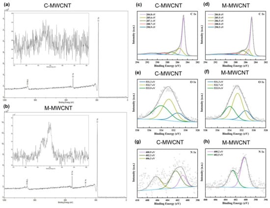 XPS analysis of the M-MWCNT and C-MWCNT: (a,b) XPS survey scan spectra of M-MWCNT and C-MWCNT. The inset is magnification of the N1s region in M-MWCNT and C-MWCNT spectrum. (c,d) Fitted XPS C1s spectra of M-MWCNT and C-MWCNT. (e,f) Fitted XPS O1s spectra of M-MWCNT and C-MWCNT. (g,h) Fitted XPS N1s spectra of M-MWCNT and C-MWCNT.