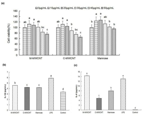 Based on the cytotoxicity analysis, we found that 30 µg/mL was the highest concentration of M-MWCNT and C-MWCNT that was not cytotoxic to macrophages. At 50 µg/mL of M-MWCNT and C-MWCNT, the survival rates of macrophages decreased significantly (p < 0.05). Furthermore, 30 µg/mL was the highest concentration of mannose that was not cytotoxic to macrophages (Figure 5a).