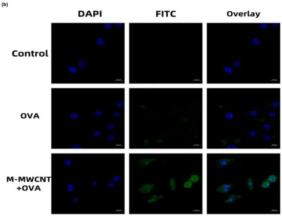 As illustrated in Figure 5b,c, the supernatant IL-1β concentration was significantly higher in the M-MWCNT group than in the C-MWCNT, mannose, OVA, and blank groups (p < 0.05). Moreover, the IL-6 concentration was significantly higher in the M-MWCNT and LPS groups than in the other group (p < 0.05). Compared to the C-MWCNT group, the IL-6 concentration was markedly higher in the M-MWCNTs group.