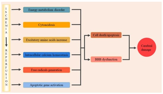 The main pathological processes of brain ischemia and reperfusion [7]. BBB, blood brain barrier. Coped with permission from Front. Mol. Neurosci. 2020, 13, 28. Copyright © 2022 Wu, Xiong, Wu, Ye, Jian, Zhi and Gu.