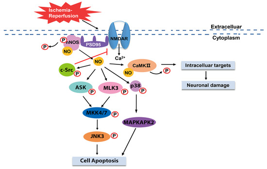The NR2B-PSD95-nNOS signaling complex is the best characterized and most widely accepted pathway related to neural cell death in brain ischemia and reperfusion. The formation of this complex is initiated during the early stage of brain I/R. It has been acknowledged that the first discovered pathological process of brain ischemia is excitotoxicity, in which excessive glutamate is released rapidly and is not recycled [18,19]. Overactivated by accumulative glutamate, the N-methyl-D-aspartate receptor (NMDAR), a type of cation-permeable inotropic receptor, mediates the Ca2+ influx, leading to an abnormal increase in the calcium concentration in the cytosol. Depending on the calcium concentration, nNOS is translocated from the cytosol and forms a complex with NR2B, a subunit of NMDAR, through the scaffolding protein PSD95 (postsynaptic density protein 95), which brings nNOS close to the NMDAR channel pore to activate nNOS. Ultimately, a large amount of neurotoxic NO is produced by the stimulated nNOS and disturbs specific signaling pathways, resulting in cell death and I/R injury in the brain [20,21,22,23].