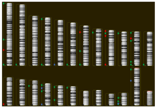 SRO Distribution across the Genome. Chromosomal locations for each SRO were used to construct a BED (Browser Extensible Data) file which was imported into Chromosome Analysis Suite (ChAS; Affymetrix, Inc./Thermo Fisher Scientific, Santa Clara, CA, USA) as a track. Green stars indicate SROs or clusters of SROs composed strictly of duplications, red stars indicate deletions, and blue stars indicate SROs that featured both types of CNVs.