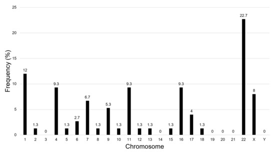 Our CMA approach identified 75 small SROs (Figure 1) with a mean size of 136.04 kilobase pairs (kb) (range, 0.21–574.57 kb), and a mean of 8.9 individuals with overlapping CNVs (range, 3–28) (Figure 2; Table 2 and Table S1). Thirty-one of the 75 SROs (41%) included at least one CNV of a patient from our center. While most SROs included a mixture of deletions and duplications, 7 SROs exclusively included deletions, while 8 included only duplications. SROs were found across the genome, with the highest frequencies of SROs found on chromosomes 22 (17 SROs) and 1 (9 SROs); no SROs were identified on chromosomes 3, 14, 19, 20, 21, or the Y chromosome (Figure 3).