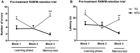 Assessment of the spatial reference memory of 12-month-old transgenic (APP/PS1) and non-transgenic mice on a radial arm water maze device. The number of errors (A) baseline and latency baseline (B) represent the difference in cognitive performance in the 5th trial of APP/PS1 transgenic mice (TG group) and non-transgenic wildtype mice (NTG group). Data of 9 days of study were grouped into 3 blocks and are expressed as the mean ± SEM (n = 5 per NTG group, n = 15 per TG group). Latency and number of errors were analyzed using a two-way ANOVA multiple comparison test. * p < 0.05, ** p < 0.01, and *** p < 0.001 for comparisons among NTG mice and APP/PS1 mice.