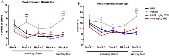 Post-treatment studies were performed after the course of the intranasal treatment with the vehicle or THC at 0.002 or 0.02 mg/kg doses. Every TG mouse from the treatment groups received intranasal administration of the vehicle or THC every day for three months. Vehicle-treated 12-month-old TG and NTG mice were used as controls. The post-treatment behavioral data show that the TG mice had significant memory decline and no ability to learn. In the fifth trial, vehicle-treated TG mice demonstrated significant behavioral impairment in both the number of errors made and the time of continuing to make the wrong choices by entering the wrong arms (latency in seconds) as compared with the NTG mice (Figure 2). Both animal groups treated with THC demonstrated a gradual improvement in learning abilities and memory functions. Through the fifth trial, the TG mice receiving THC intranasally showed a significantly lower number of errors and latencies than the TG mouse control group. THC-treated APP/PS1 mice showed a remarkable improvement in latency, by spending half as much time on finding the platform and escaping from the maze. Both THC-treated animal groups made 67% less errors by the end of all trial sessions. It should be noted that both the 0.002 and 0.02 mg/kg THC doses were equally effective in memory protection. Importantly, no evidence of a significant difference in both behavior parameters was found between the NTG control mice and THC-treated APP/PS1 mice. The RAWM study demonstrated that low-dose THC effectively slowed down Alzheimer’s-associated memory decline or even restored memory functions.