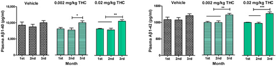 Determination of Aβ1–40 and Aβ1–42 levels in the plasma of APP/PS1 mice using ELISA. Plasma samples were collected from the APP/PS1 mice every month after beginning intranasal THC treatment. No significant difference in Aβ1–40 and Aβ1–42 levels was found among the study groups. Plasma Aβ1–40 and Aβ1–42 levels of THC-treated animals significantly increased by the 3rd month of treatment. The data are expressed as the mean ± SEM (n = 5 per group). * p < 0.05, ** p < 0.01, and *** p < 0.001. A one-way repeated measures ANOVA was used to analyze the data, followed by a Tukey post hoc multiple comparison test.