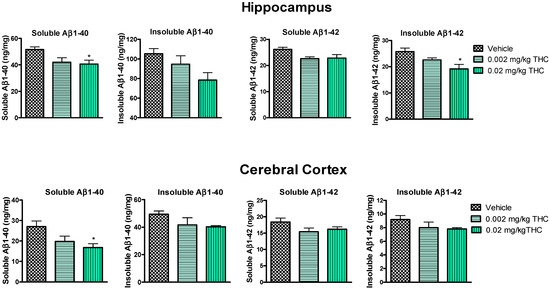 Hippocampal and cerebrocortical levels of Aβ peptides were assessed after three months of daily intranasal treatment. Overall, the treatment of either 0.002 or 0.02 mg/kg of THC had a beneficial effect on the reduction in the Aβ concentration in the brain in comparison to the vehicle-treated brain tissue samples (Figure 4). More importantly, the continuous 0.02 mg/kg THC intranasal treatment significantly lowered the amount of the soluble Aβ1–40 form in the hippocampus and cerebral cortex. Additionally, the insoluble Aβ1–42 peptide level was significantly reduced in hippocampal samples from 0.02 mg/kg THC-treated mice. The results from the brain tissue study show that THC at a dose of 0.02 mg/kg tended to decrease the soluble and insoluble Aβ1–40 and Aβ1–42 peptide levels.