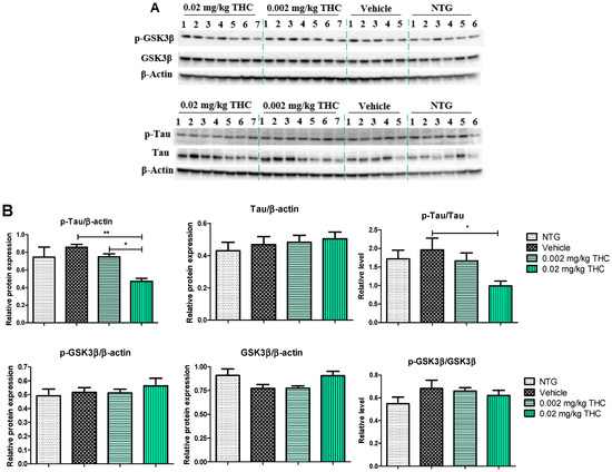 The effects of low-dose THC intranasal treatment on tau, phospho-tau (p-tau), GSK3β, and phospho-GSK3β (p-GSK3β) expression in the APP/PS1 mice were evaluated by immunoblotting analysis. The tau defect that leads to aggregation and neurodegeneration is referred to as hyperphosphorylated tau [18]. Tau phosphorylation is highly regulated via protein kinases. Numerous studies have shown that GSK3β robustly phosphorylates a broad range of substrates, including a majority of sites on tau [19]. Importantly, GSK3β phosphorylation leads to inhibition of GSK3β kinase activity and the formation of p-tau aggregates [20]. As shown in Figure 5, p-tau expression in the APP/PS1 mouse brains after the 3 months of 0.02 mg/kg THC treatment was significantly lower than in the vehicle- and 0.002 mg/kg THC-treated mouse brains. No significant difference in tau, GSK3β, and p-GSK3β expression was found between NTG mice and APP/PS1 mice treated with the vehicle or THC. Thus, prolonged 0.02 mg/kg THC intranasal treatment significantly decreased the p-tau level without affecting GSK3β.