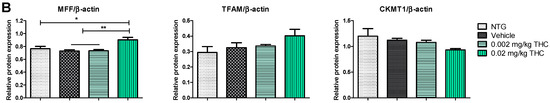 In order to substantiate this significant behavioral improvement and reduction in Aβ aggregates, we checked the neuropathologic parameters within the brain. Specifically, the 3-month course administration of 0.002 and 0.02 mg/kg of THC resulted in a dose-dependent reduction (up to 12.6% and 45.2%, respectively) in the p-tau protein content in the brain in comparison to the TG controls (Figure 5), with no significant influence on GSK3β and p-GSK3β. THC’s ability to decrease the p-tau level is beneficial as tau influences, directly and indirectly, the mitochondrial transport along the neuronal axon, and mitochondrial functions [26,27]. Even though mitochondrial dysfunction has been indicated as an underlying mechanism of AD pathophysiology, no mitochondrial marker impairments within the TG APP/PS1 control group were detected. Additionally, we found that continuous intranasal treatment with 0.02 mg/kg of THC could stimulate (up to 23.7%) MFF expression (Figure 6), which demonstrates an increase in fission. Thus, our future studies will be directed at the impact of THC on fusion markers in order to test if mitochondrial dynamics are in balance.
