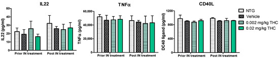 Cytokines are involved in various physiological and pathological pathways; therefore, the alterations in cytokine levels reflect the disturbance of the immune system in AD. The multiplex immunoassay platform was implemented for the cytokine profile study. Within this study, we observed a few Alzheimer’s-related inflammatory molecules: tumor necrosis factor α (TNFα), as the main player in AD pathophysiology [21]; IL-22, and CD40 ligand, which are associated with BBB disruption and neuroinflammation increase [22,23,24]. The effect of THC on plasma cytokine levels was evaluated before and after the intranasal administration of 0.002 and 0.02 mg/kg THC daily for 3 months. The results show no changes in the IL-22, TNFα, or CD40L profiles between the TG and NTG animals. Importantly, the THC treatment results show no effect on cytokine levels in the blood, probably due to the reduced systemic exposure.