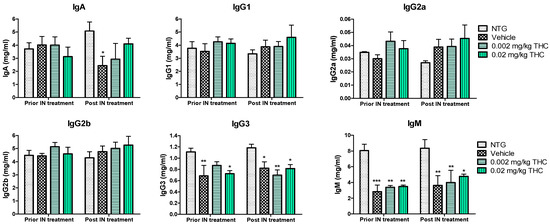 An immunoglobulin (Ig) isotyping multiplex assay was employed to assess the effect of low-dose THC intranasal treatment on the immunological changes. As shown in Figure 4, IgG1, IgG2a, IgG2b, IgG3, IgA, and IgM levels did not undergo any significant changes after the 0.002 or 0.02 mg/kg THC treatment. Additionally, no evidence of improvement or alteration in immunoglobulin levels was detected. Notably, the three APP/PS1 mouse groups demonstrated steadily lower IgG3 and IgM concentrations in plasma in comparison with the NTG controls. Additionally, the IgA plasma concentration in vehicle-treated TG mice decreased significantly compared to that of the NTG control. In contrast, the obtained data do not indicate any statistically significant difference in IgA levels between the THC-treated TG mice and the NTG controls. Additionally, the level of IgM in blood samples taken from mice after 3 months of 0.02 mg/kg THC treatment slightly improved in comparison to the blood sample data prior to treatment.