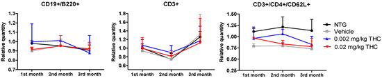 The immune system is an integral component of the inflammatory response in the pathophysiology of AD. The aim of this study was to evaluate the differences in immune system parameters in TG mice, in mice treated with the vehicle or THC (0.002 or 0.02 mg/kg dose) daily for 3 months, and in non-treated NTG controls. The relationship between the changes in peripheral blood parameters was investigated using flow cytometry analysis. Three groups of TG mice showed no difference in values compared to the NTG controls, particularly in three parameters: relative and absolute counts of CD3+ naïve T cells; relative and absolute counts of CD3+/CD4+/CD62L+ helper T lymphocytes; and absolute count of CD19+/B220+ resting B cells.
