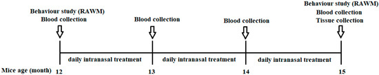 Schematic illustration of the animal testing timeline. NTG control mice and TG mice (12 months of age) were divided into four groups: (1) NTG control; (2) APP/PS1 TG control; (3) APP/PS1—0.002 mg/kg THC treatment; and (4) APP/PS1—0.02 mg/kg THC treatment. Prior to the start of any treatment, groups were balanced with respect to gender, plasma Aβ level, body weight, and baseline memory test results within gender. TG animals were administered intranasal treatment of the vehicle or THC daily for 3 months. Individual animals were subjected to the radial arm water maze test before and after the treatment started. Plasma samples prepared from whole blood were collected monthly and stored at −80 °C. All the animals were euthanized after completing the treatment. Brain tissue samples were collected, and each region was immediately frozen in liquid nitrogen and stored at −80 °C.