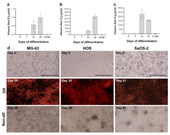 Exposure to differentiation media-induced mineralization in (a) MG-63, (b) HOS, and (c) SaOS-2 cells as determined by Alizarin Red S staining. Average deviation and standard deviation of spectrophotometric measurements of Alizarin Red S staining are shown for three independent experiments. (d) Representative microscopic images of cells at the beginning (day 0) and end (day 21 or 35) of differentiation procedure for differentiated and non-differentiated cells. Scale bars correspond to 1 mm.