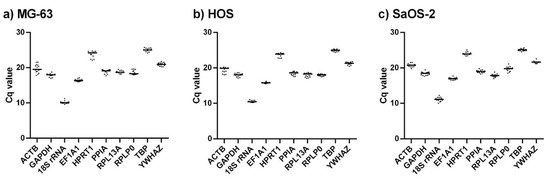 BestKeeper ranks genes’ stability based on their standard deviation (SDCq value; ±Cq), coefficient of variation (CVCq value; % Cq), and correlation coefficient (r). MG-63 and HOS share EF1A1 as a gene with the lowest SD (0.259 for MG-63 and 0.124 for HOS) and ACTB as the gene with the highest SD (1.011 for MG-63 and 0.666 for HOS). In SaOS-2, YWHAZ exhibits the lowest SD (0.209) and RPLP0 the highest SD (0.514). As BestKeeper’s requirement for stable gene is SD < 1, all genes, with the exception of ACTB in MG-63, were considered stable.