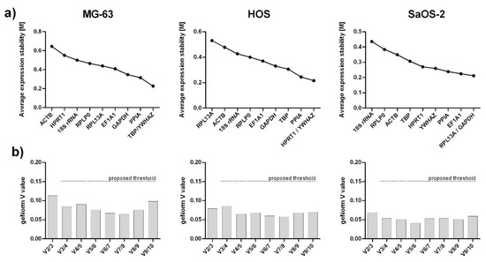 The pairwise variations analysis showed that the pairwise value V2/3 in every cell line is already below 0.15 (0.113 for MG-63, 0.079 for HOS, 0.069 for SaOS-2); therefore, the normalization to two most stable genes is sufficient and the addition of the third normalization gene does not contribute significantly to the reliability of the results (Figure 3b).
