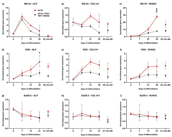 The choice of reference gene can impact obtained gene expression. MG-63 (a–c), HOS (d–f), and SaOS-2 (g–i) cell lines were differentiated and expression of ALP (Alkaline Phosphatase) (a,d,g), COL1A1 (Collagen type I alpha 1 chain) (b,e,h), and RUNX2 (Runt-related transcription factor 2) (c,f,i) differentiation markers was analysed at given time points using RT-qPCR. The relative quantity of each marker gene was normalized to ACTB (red) or to geometric mean of TBP, PPIA, YWHAZ, and EF1A1 (black) internal control genes. Results represent the mean and standard error of relative expression for three independent experiments. Statistical differences between the two normalizations were analysed using two-way ANOVA and are denoted as * p ≤ 0.05 and *** p ≤ 0.001.